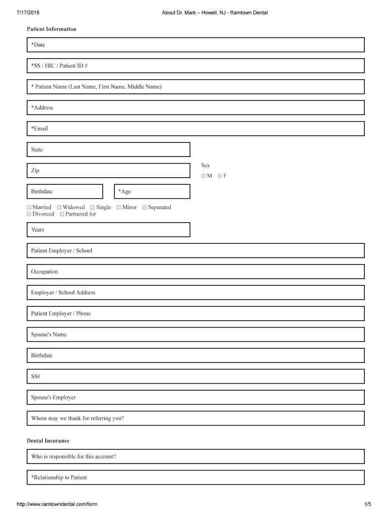 7/17/2018About Dr. Mark Howell, NJ Ram town DentalPatient Information *Date *SS / HIC / Patient ID # * Patient Name (Last Name, First Name, Middle Name) *Address *Email State SexZipMBirthdate Married