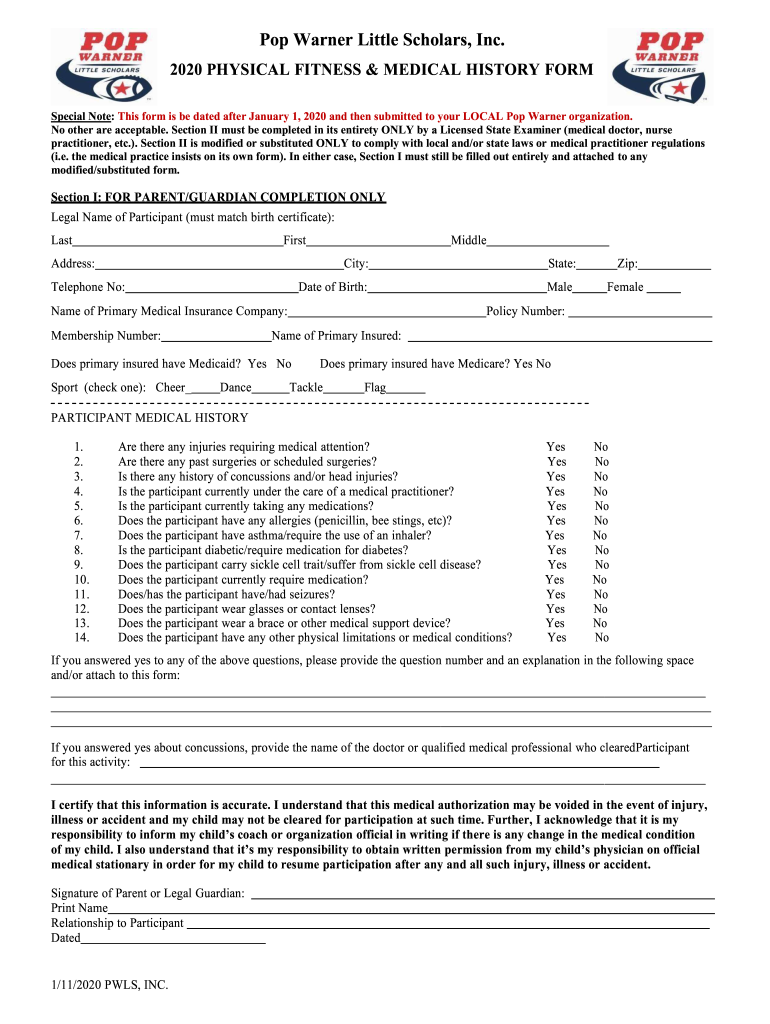 Pop Warner Little Scholars, Inc. 2020 PHYSICAL FITNESS & MEDICAL HISTORY FORM Special Note: This form is been dated after January 1, 2020, and then submitted to your LOCAL Pop Warner organization.