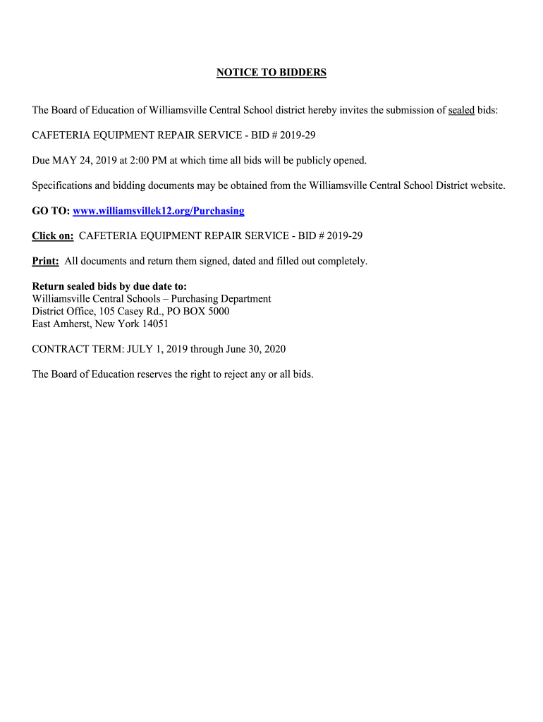NOTICE TO BIDDERS The Board of Education of Williamsville Central School district hereby invites the submission of sealed bids: CAFETERIA EQUIPMENT REPAIR SERVICE BID # 201929 Due MAY 24, 2019, at