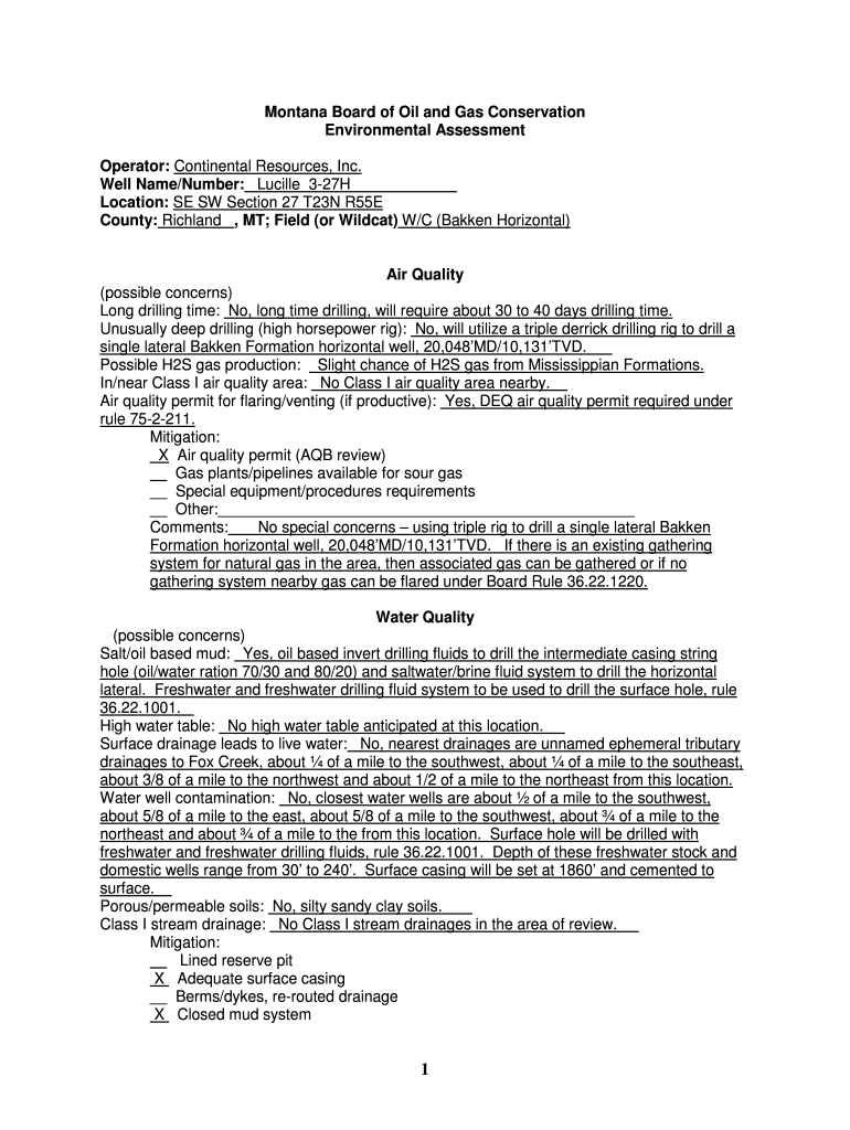 Montana Board of Oil and Gas Conservation Environmental Assessment Operator: Continental Resources, Inc. Well Name/Number: Lucille 327H Location: SE SW Section 27 T23N R55E County: Richland, MT; Field