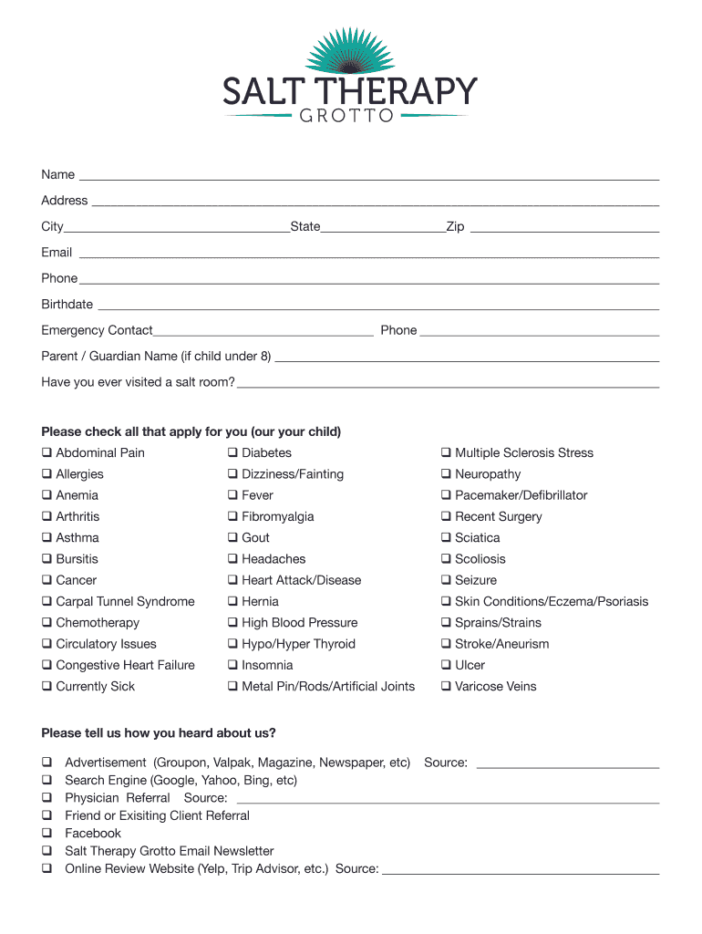 Name Address City State Zip Email Phone Birthdate Emergency Contact Phone Parent / Guardian Name (if child under 8) Have you ever visited a salt room? Please check all that apply for you (our your