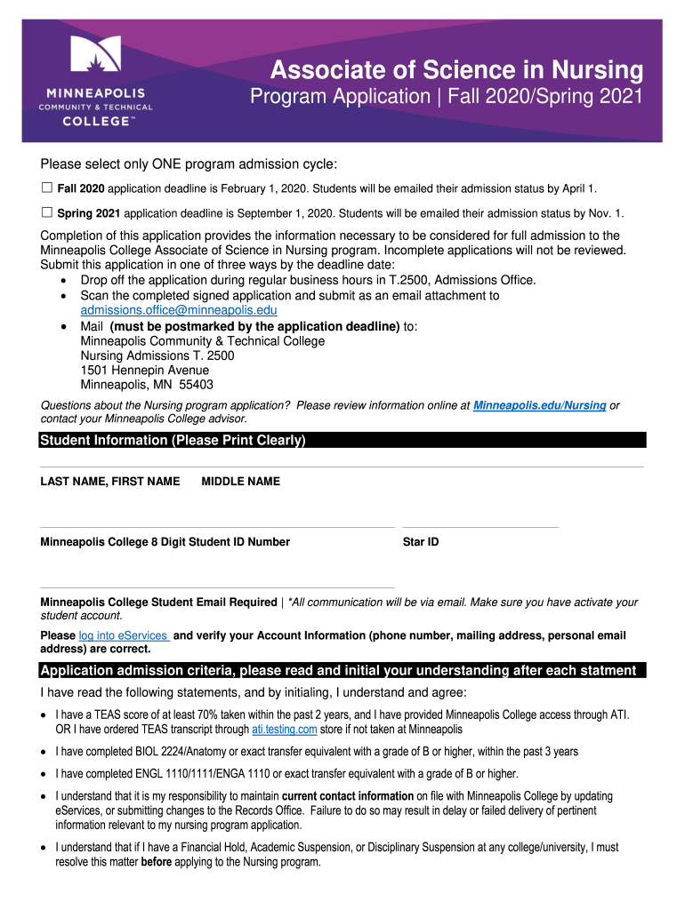 Associate of Science in Nursing Program Application Fall 2020/Spring 2021 Please select only ONE program admission cycle: Fall 2020 application deadline is February 1, 2020. Students will be emailed