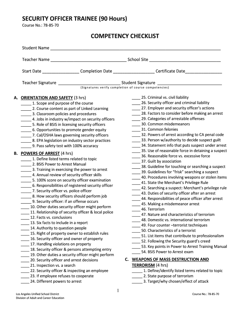 SECURITY OFFICER TRAINEE (90 Hours) Course No.: 788570 COMPETENCY CHECKLIST Student Name Teacher Name School Site Start Date Completion Date Certificate Date Teacher Signature Student Signature (Signatures