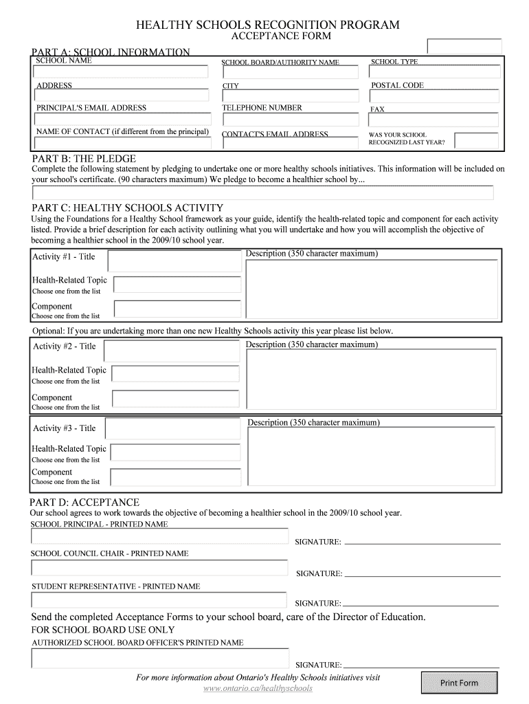 The Healthy Schools Recognition Program Acceptance Form is a document used by schools in Ontario, Canada, to pledge and outline their commitment to healthy school initiatives for the school year.