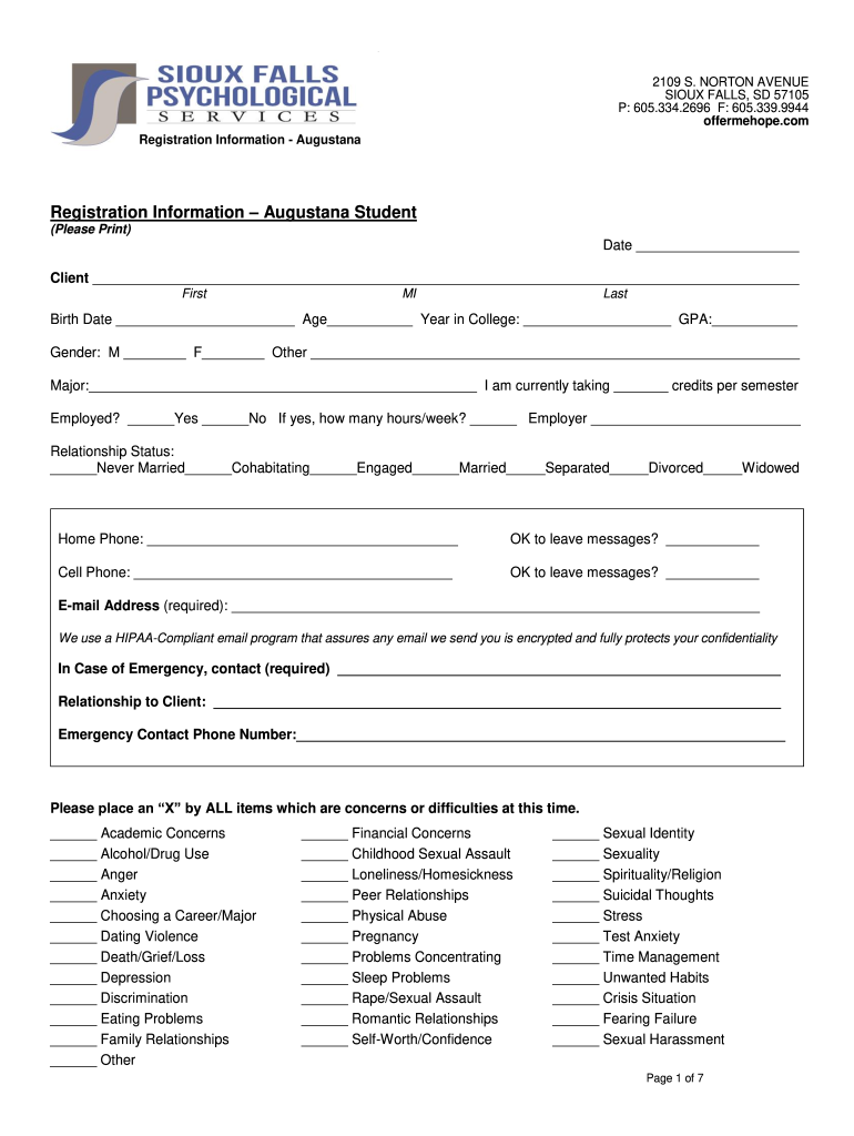 2109 S. NORTON AVENUE SIOUX FALLS, SD 57105 P: 605.334.2696 F: 605.339.9944 offermehope.com Registration Information AugustanaRegistration Information Augustan Student (Please Print)Date Client FirstMILastBirth