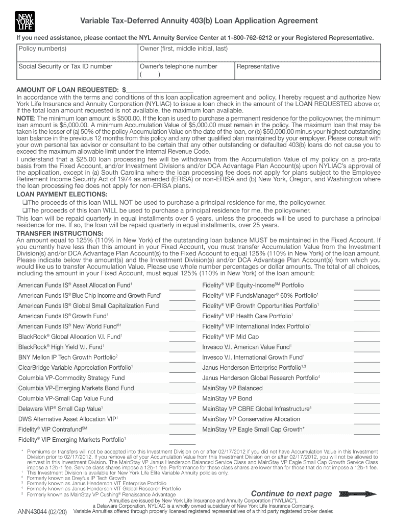 Variable Deferred Annuity 403(b) Loan Application Agreement If you need assistance, please contact the NFL Annuity Service Center at 18007626212 or your Registered Representative. Policy number(s)Owner