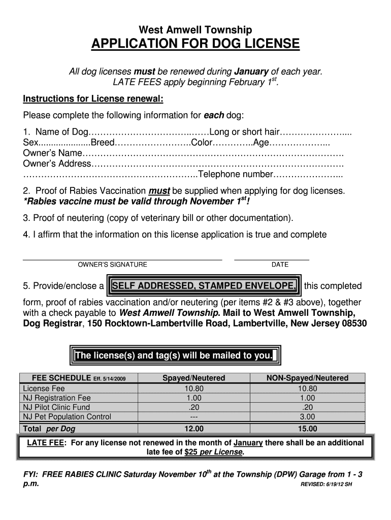 West Am well Township APPLICATION FOR DOG LICENSE All dog licenses must be renewed during January of each year. LATE FEES apply beginning February 1st. Instructions for License renewal: Please complete