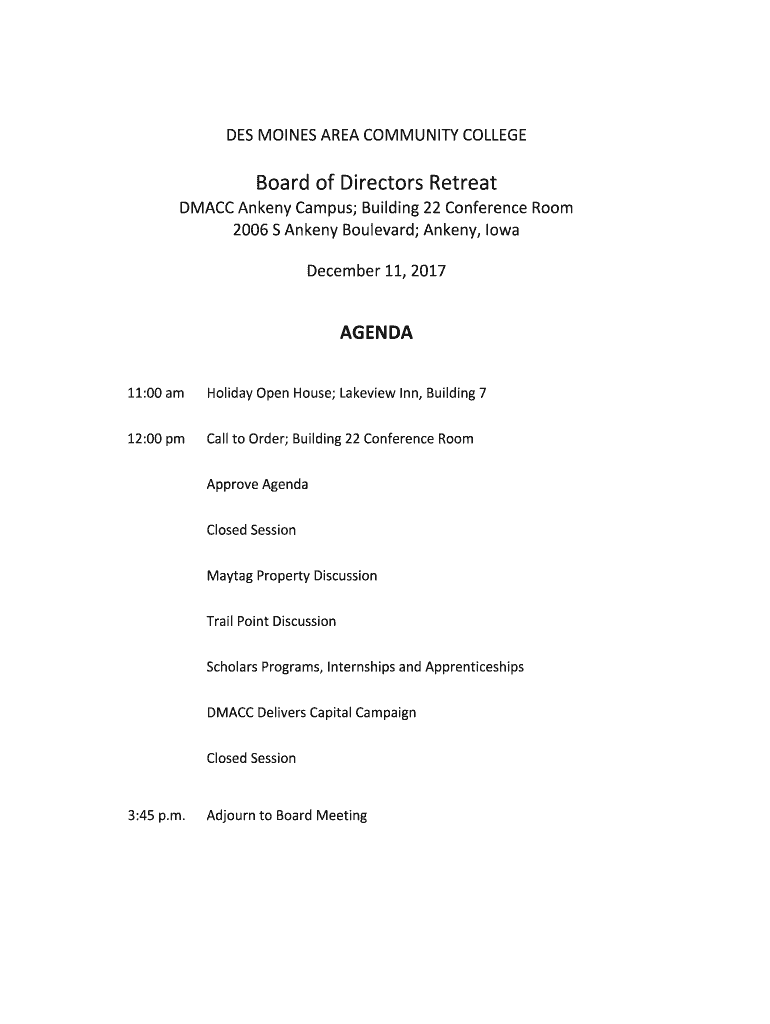 DESMOINESAREACOMMUNITYCOLLEGE BoardofDirectorsRetreat DMACCAnkenyCampus;Building22ConferenceRoom 2006SAnkenyBoulevard;Ankeny, Iowa December11,2017 AGENDA 11:00am 12:00pm HolidayOpenHouse;LakeviewInn,Building7