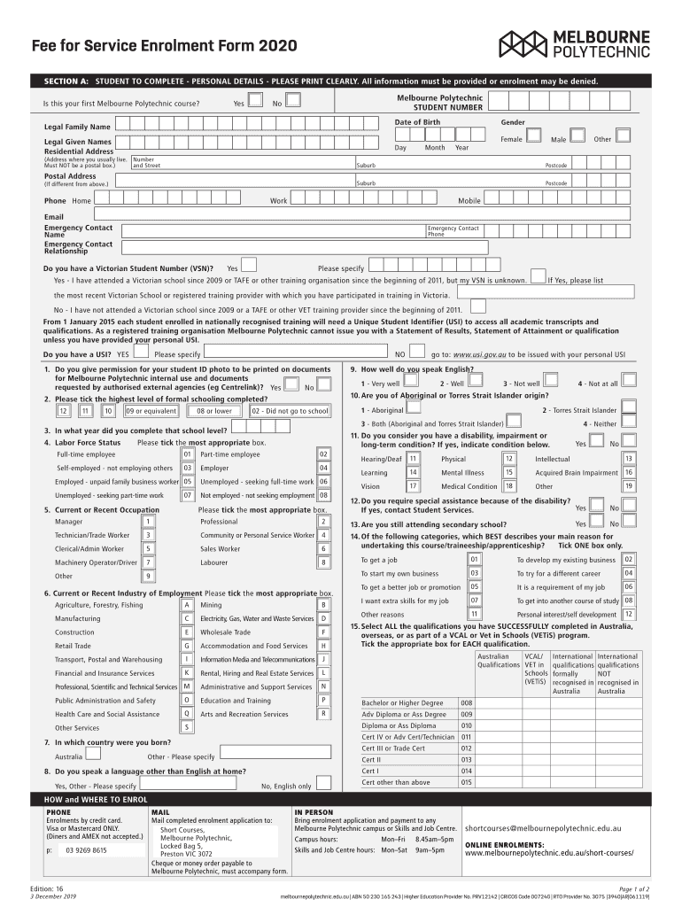 Fee for Service Enrollment Form 2020 SECTION A:STUDENT TO COMPLETE PERSONAL DETAILS PLEASE PRINT CLEARLY. All information must be provided or enrollment may be denied. Is this your first Melbourne