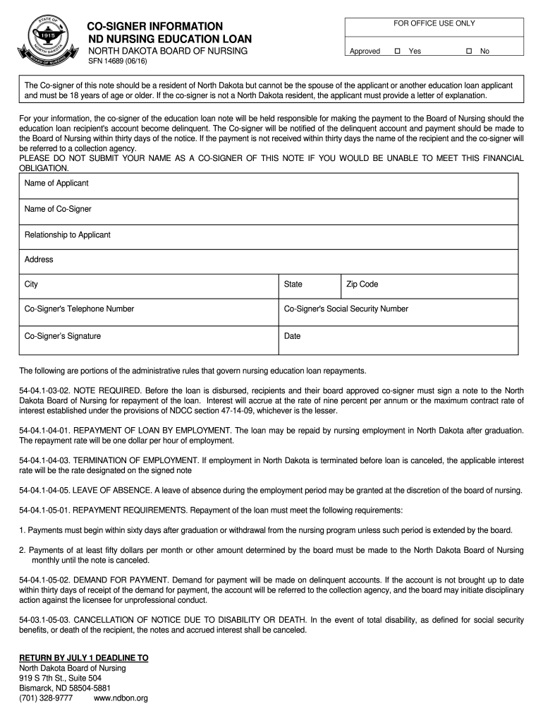 NORTH DAKOTA BOARD OF NURSINGApprovedYesNoSFN 14689 (06/16)The Cosigner of this note should be a resident of North Dakota but cannot