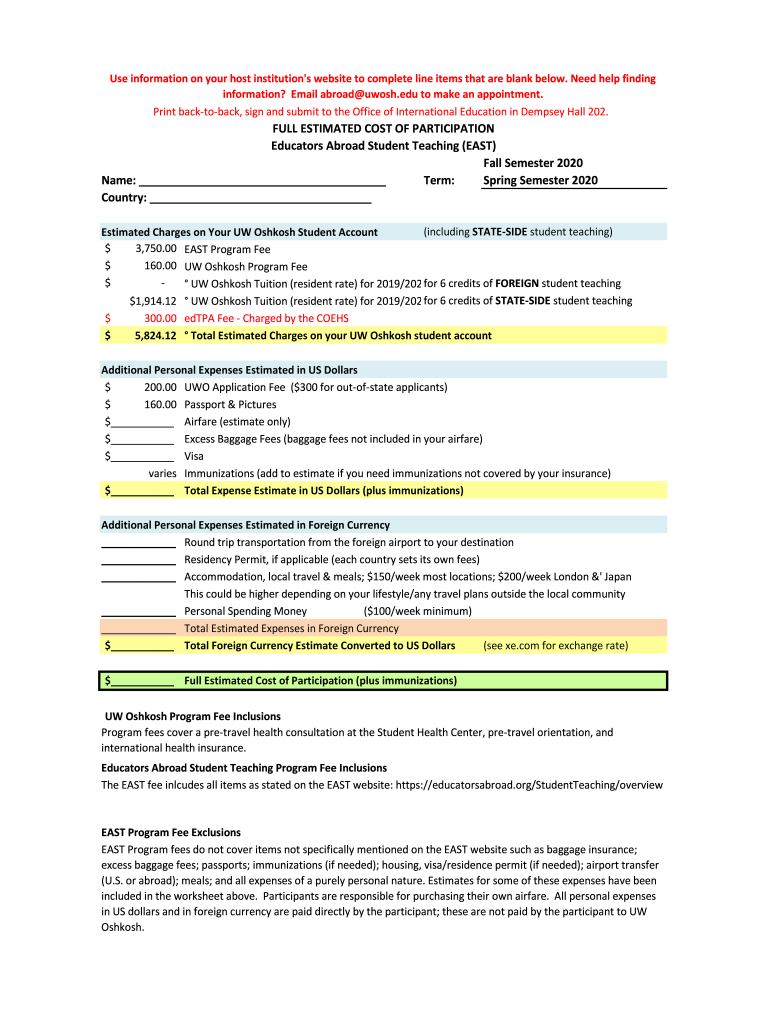 Use information on your host institution's website to complete line items that are blank below. Need help finding information? Email abroad wish.edu to make an appointment. Print backtrack, sign and