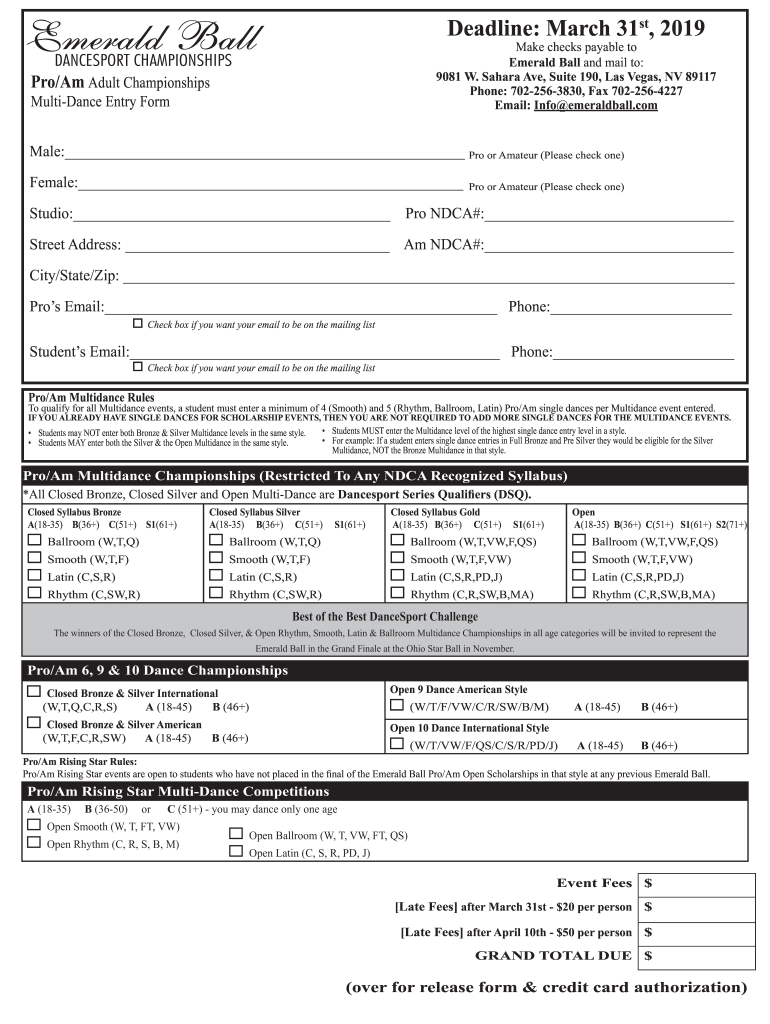 Deadline: March 31st, 2019Make checks payable to Emerald Ball and mail to: 9081 W. Sahara Ave, Suite 190, Las Vegas, NV 89117 Phone: 7022563830, Fax 7022564227 Email: Info emerald ball.comDANCESPORT