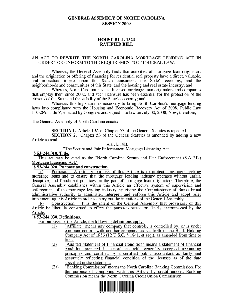 AN ACT TO REWRITE THE NORTH CAROLINA MORTGAGE LENDING ACT IN