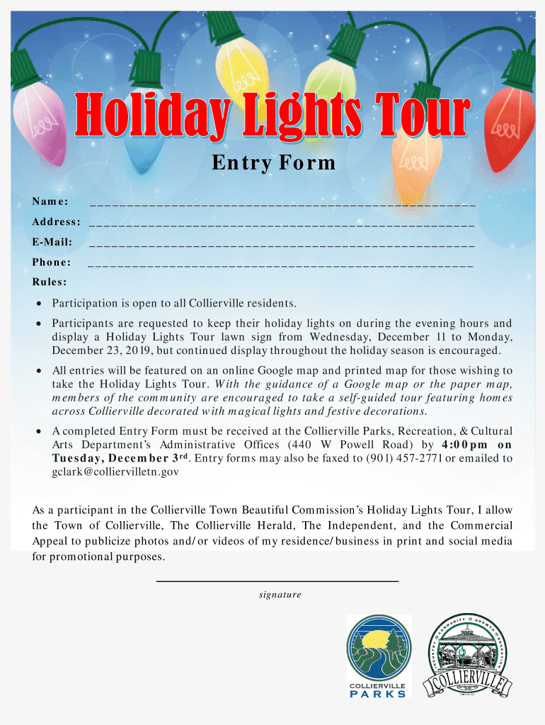 Entry Form Name: Address: Email: Phone: Rules: Participation is open to all Collierville residents. Participants are requested to keep their holiday lights on during the evening hours and display