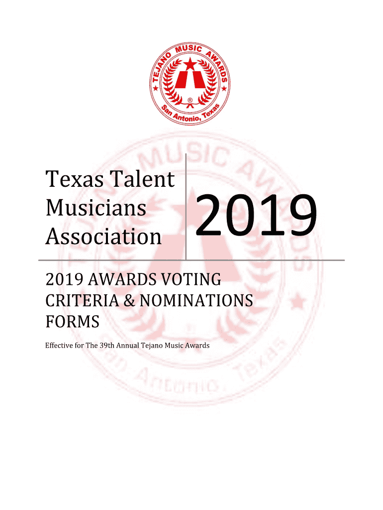 Texas Talent Musicians Association20192019 AWARDS VOTING CRITERIA & NOMINATIONS FORMS Effective for The 39th Annual Techno Music Barnstable OF CONTENTS Greetings. 2 Specific Guidelines.... 3 Overview