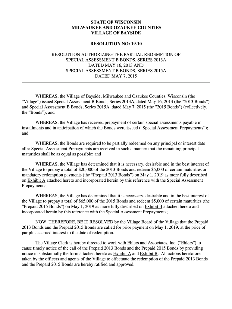STATE OF WISCONSIN MILWAUKEE AND YANKEE COUNTIES VILLAGE OF BAYSIDE RESOLUTION NO: 1910 RESOLUTION AUTHORIZING THE PARTIAL REDEMPTION OF SPECIAL ASSESSMENT B BONDS, SERIES 2013A DATED MAY 16, 2013,