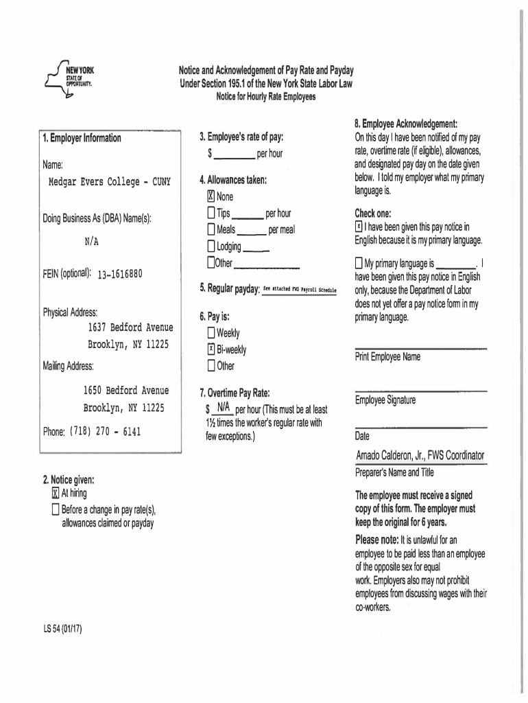 4Notice and Acknowledgement of Pay Rate and Payday Under Section 195.1 of the New York State Labor Law Notice for Hourly Rate EmployeesWYORK TTF PPOTIJNITY.1. Employer Information Name: Edgar Every