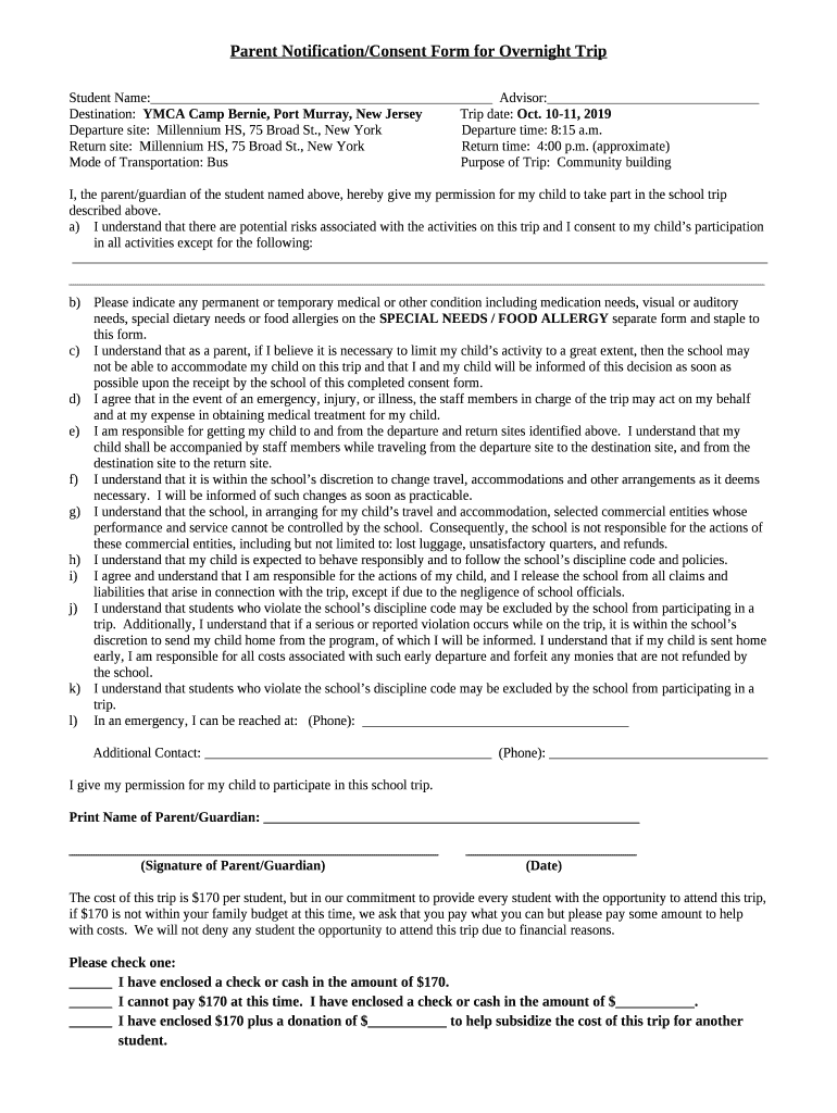 Parent Notification/Consent for Overnight Trip template instructions