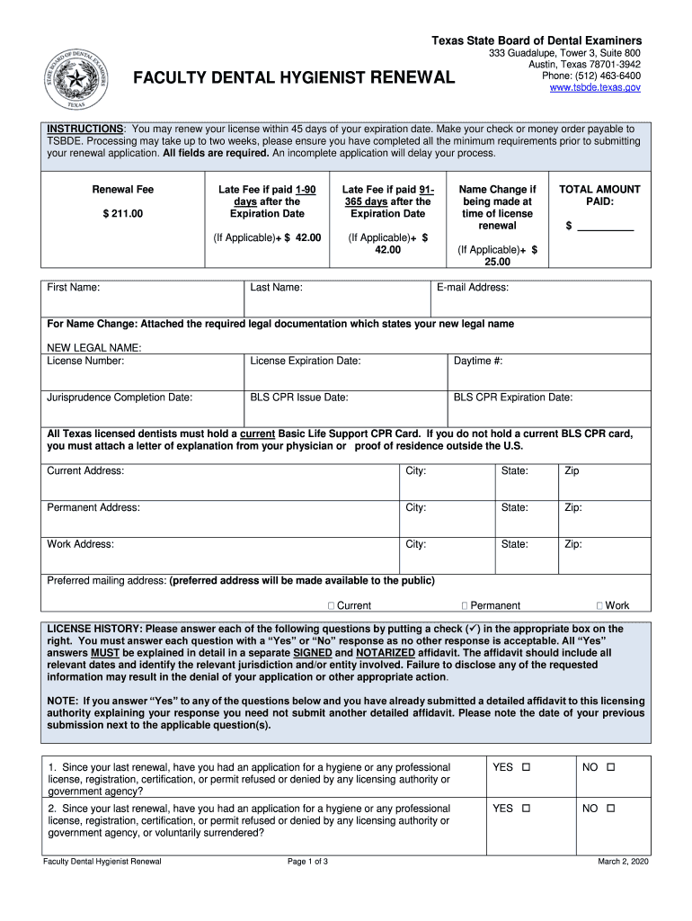 Texas State Board of Dental ExaminersFACULTY DENTAL HYGIENIST RENEWALFORM333 Guadalupe, Tower 3, Suite 800