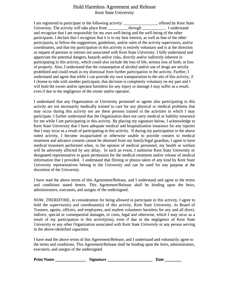 Frequently asked questions about KENT STATE UNIVERSITY HOLD HARMLESS AGREEMENT AND RELEASE template