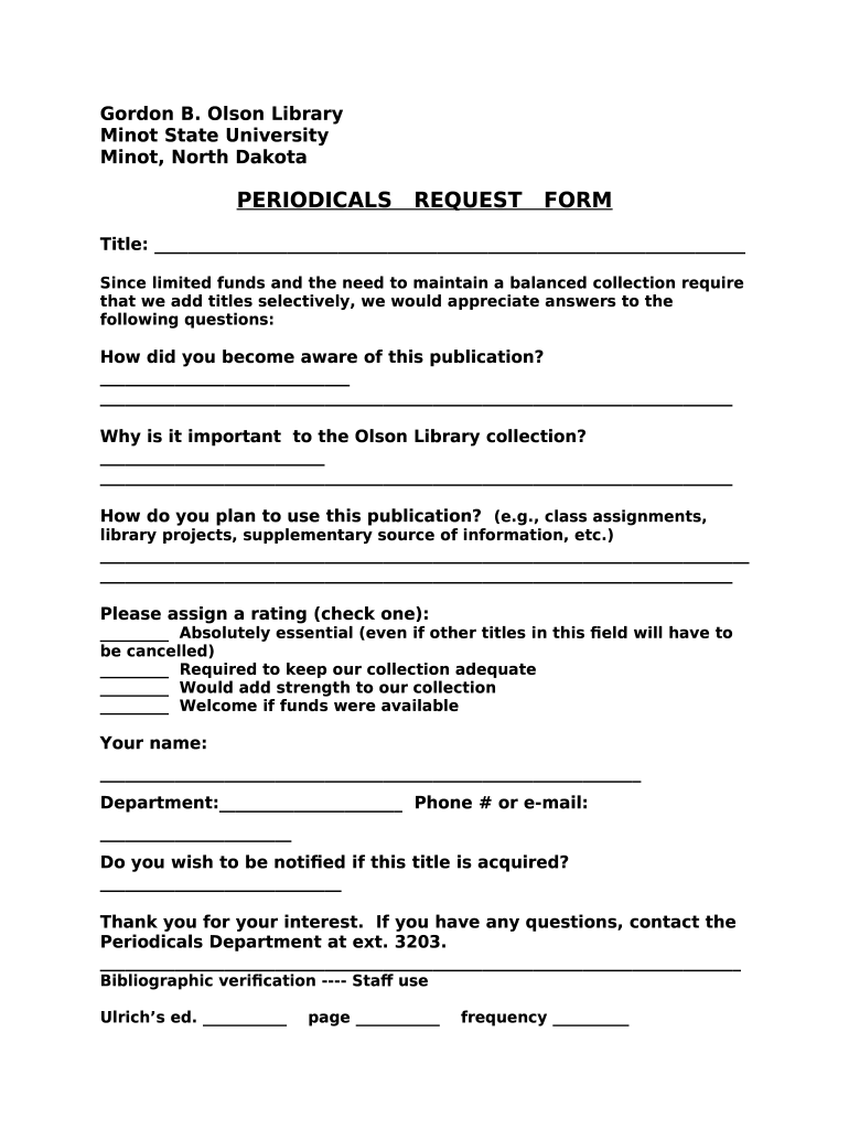 Instructions for the Since limited funds and the need to maintain a balanced collection require that we add titles selectively, we would appreciate answers to the following questions: form