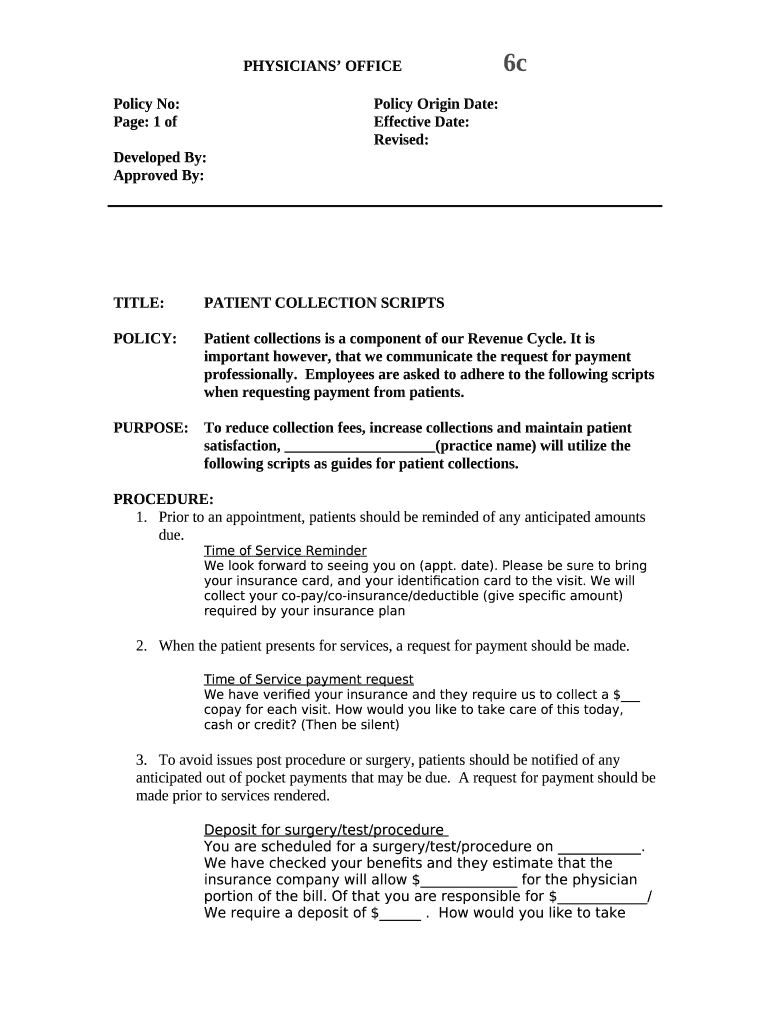The TITLE:Patient collection scripts is a writable document required to be submitted to the relevant address to provide specific info. It needs to be filled-out and signed, which can be done manually in hard copy, or with the help of a certain solution such as PDFfiller. This tool helps to complete any PDF or Word document directly in your browser, customize it according to your purposes and put a legally-binding electronic signature. Right away after completion, user can send the TITLE:Patient collection scripts to the appropriate recipient, or multiple ones via email or fax. The blank is printable as well thanks to PDFfiller feature and options presented for printing out adjustment. In both electronic and in hard copy, your form should have a neat and professional look. It's also possible to save it as the template for later, there's no need to create a new file again. All that needed is to edit the ready form.