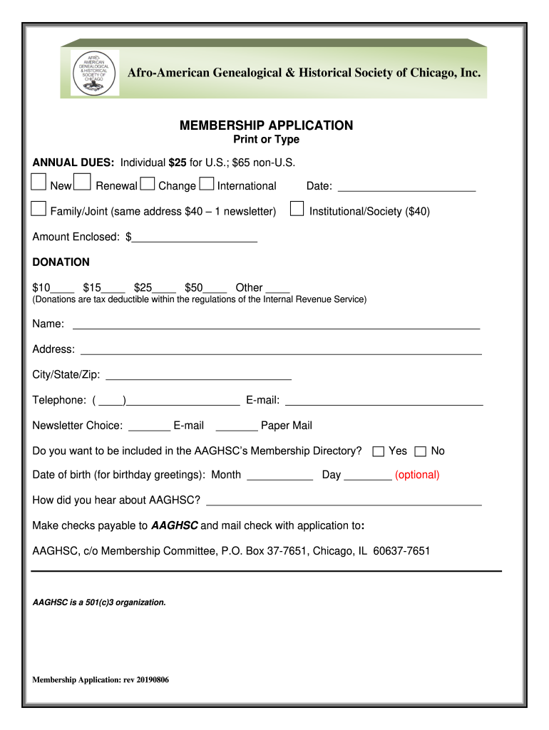 Afro-American Genealogical & Historical Society of Chicago, Inc. MEMBERSHIP APPLICATION Print or Type ANNUAL DUES: Individual $25 for U.S.; $65 non. S. NewRenewalChangeInternationalFamily/Joint (same