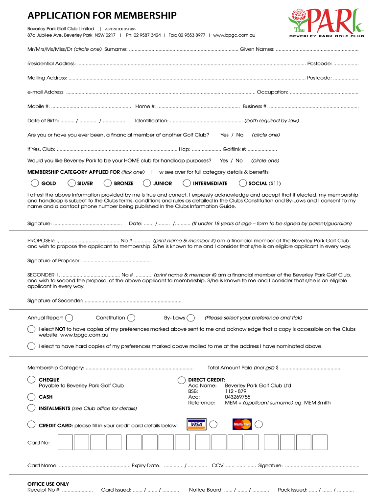 APPLICATION FOR MEMBERSHIP Beverley Park Golf Club Limited ABN: 60 000 051 38387a Jubilee Ave, Beverley Park NSW 2217 pH: 02 9587 3424 Fax: 02 9553 8977 www.bpgc.com.auMr/Mrs/Ms/Miss/Dr (circle one)