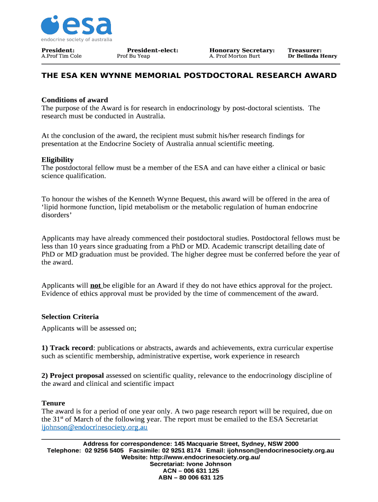 Template THE ESA KEN WYNNE MEMORIAL POSTDOCTORAL RESEARCH AWARD instructions