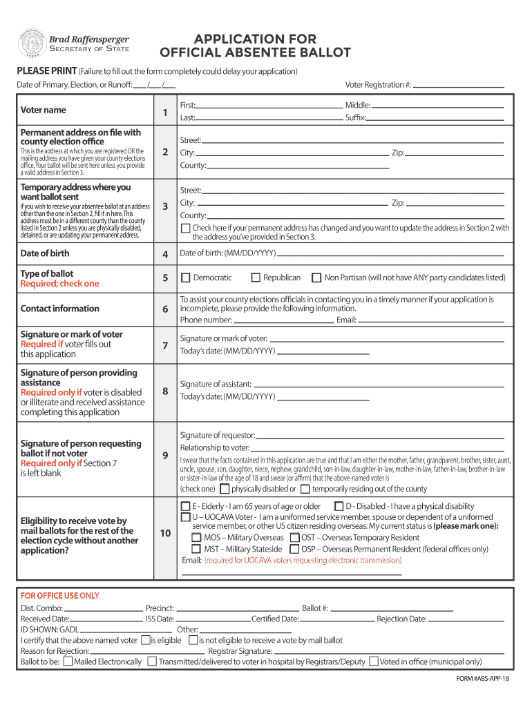 OFFICIAL ABSENTEE BALLOT Brad RaffenspergerSecretary of Stateless PRINT (Failure to fill out the form completely could delay your application)
