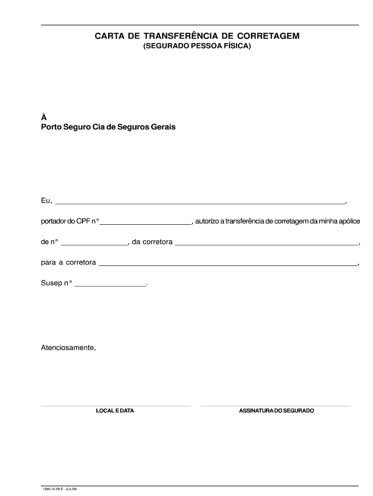 A Carta de Transferência de Corretagem é um documento fundamental no Brasil, utilizado para autorizar a mudança da corretora responsável pela gestão de uma apólice de seguro. Este formulário é essencial para formalizar a transferência de apólice de seguro de um corretor para outro, garantindo que o segurado continue protegido. A assinatura do segurado é um requisito indispensável para a validade do documento, assegurando que a transferência ocorra de maneira legal e transparente.