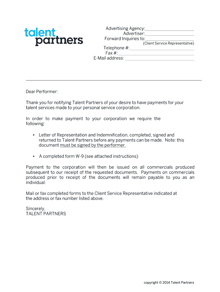 When submitting the Talent Partners Payment Form, you will need to include a completed Form W-9 and a Letter of Representation and Indemnification to ensure proper processing of payments.