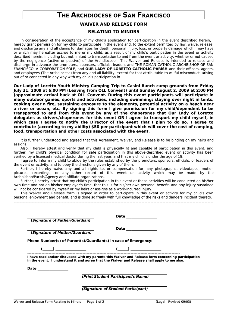 The Our Lady of Loretto Youth Ministry Camping Trip to Casini Ranch camp grounds from Friday July 31, 2009 at 6:00 PM (Leaving from OLL Convent) until Sunday August 2, 2009 at 2:00 PM (approximate arrival back at OLL Convent is a document you can get completed and signed for specified purpose. In that case, it is provided to the relevant addressee to provide specific information and data. The completion and signing can be done or with a trusted tool like PDFfiller. Such applications help to submit any PDF or Word file without printing out. It also lets you customize it depending on the needs you have and put a valid e-signature. Once you're good, the user sends the Our Lady of Loretto Youth Ministry Camping Trip to Casini Ranch camp grounds from Friday July 31, 2009 at 6:00 PM (Leaving from OLL Convent) until Sunday August 2, 2009 at 2:00 PM (approximate arrival back at OLL Convent to the respective recipient or several recipients by mail or fax. PDFfiller has got a feature and options that make your template printable. It offers a number of settings when printing out. No matter, how you will send a form - in hard copy or electronically - it will always look neat and clear. To not to create a new document from scratch over and over, turn the original file into a template. Later, you will have an editable sample.