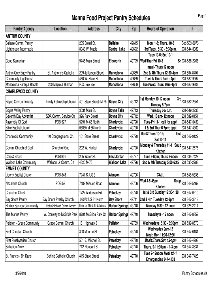 Page 1Manna Food Project Pantry Schedules Pantry/Agency ANTRUM COUNTYLocationAddressCityZipHours of Operation Mon. 15; Thurs. 105 3rd Tues., 5:30 6:30p.m. Tues 106; Sat 101 Wed/Thur/Fri 103 Sr meal