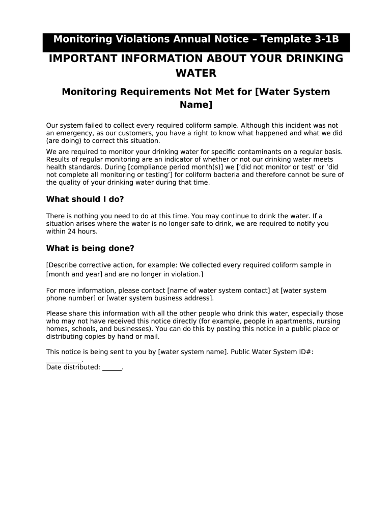 The Tier 3 PN Templates for Community and Nontransient Noncommunity Water Systems. Tier 3 PN Templates for Community and Nontransient Noncommunity Water Systems is a writable document that can be completed and signed for specified purpose. Next, it is provided to the exact addressee in order to provide some details of certain kinds. The completion and signing is possible or via a suitable application e. g. PDFfiller. These tools help to complete any PDF or Word file online. It also allows you to edit it according to the needs you have and put legit electronic signature. Once done, the user ought to send the Tier 3 PN Templates for Community and Nontransient Noncommunity Water Systems. Tier 3 PN Templates for Community and Nontransient Noncommunity Water Systems to the recipient or several recipients by mail and also fax. PDFfiller is known for a feature and options that make your blank printable. It includes various options for printing out. It does no matter how you'll deliver a document - physically or electronically - it will always look neat and organized. To not to create a new editable template from scratch again and again, turn the original document as a template. Later, you will have an editable sample.