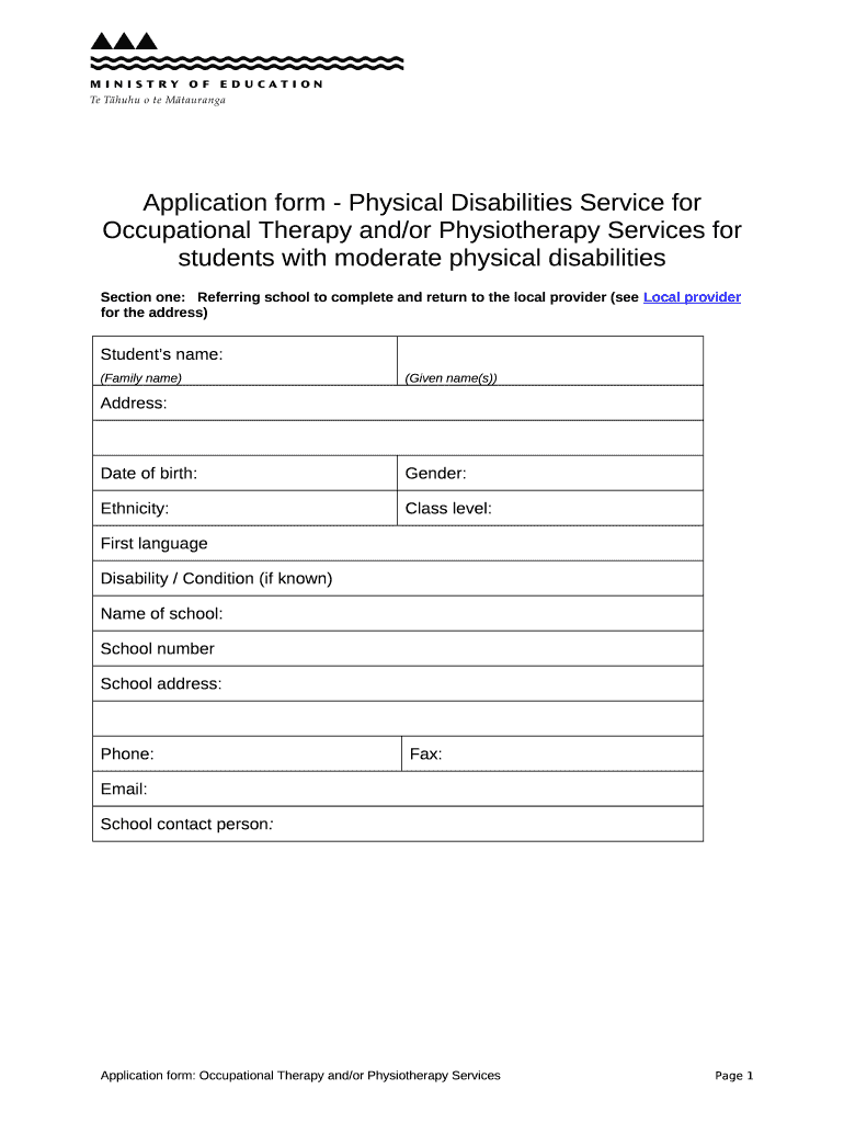 Instructions for the form Application OT/Physiotherapy. Application for physical disabilities service