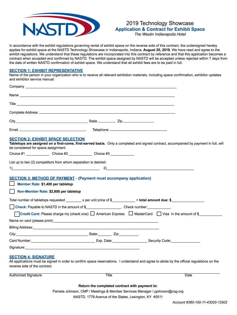 2019 Technology ShowcaseApplication & Contract for Exhibit Space The Weston Indianapolis Hotel In accordance with the exhibit regulations governing rental of exhibit space on the reverse side of this
