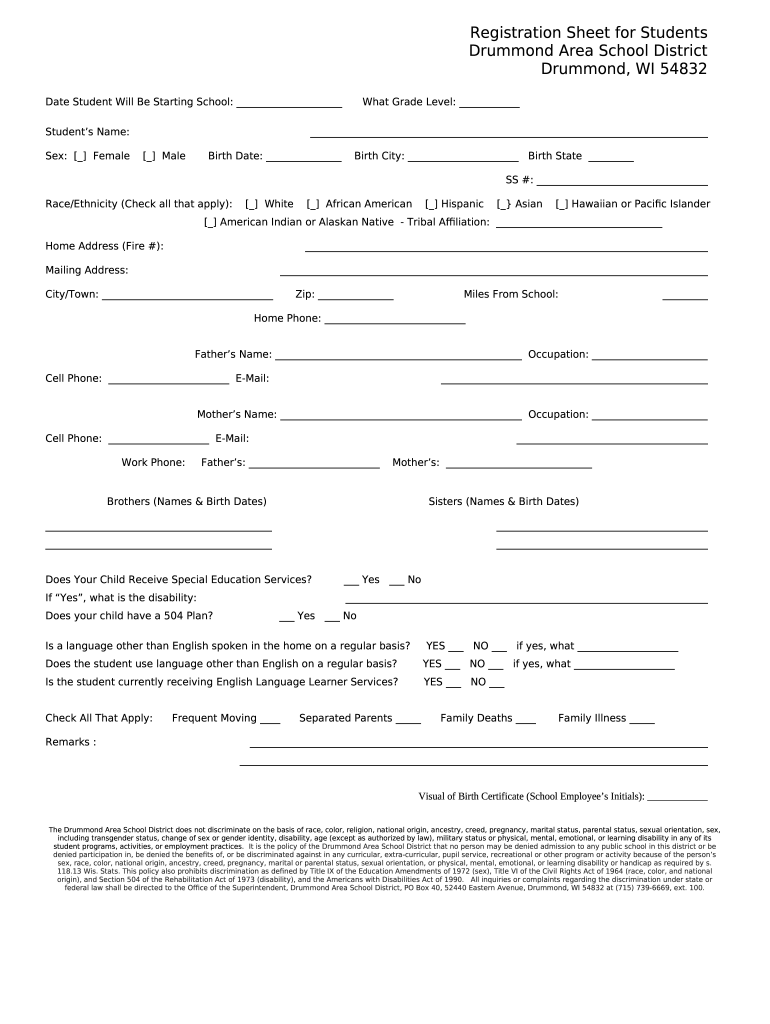 Instructions for the form Registration Sheet for New Students - Drummond High School