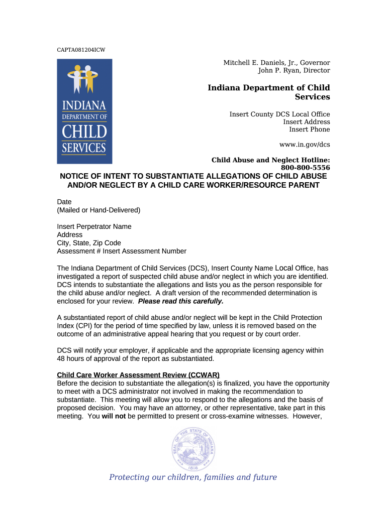 How to fill Notice OF INTENT TO SUBSTANTIATE ALLEGATIONS OF CHILD ABUSE AND/OR NEGLECT BY A CHILD CARE WORKER/Resource parent word template