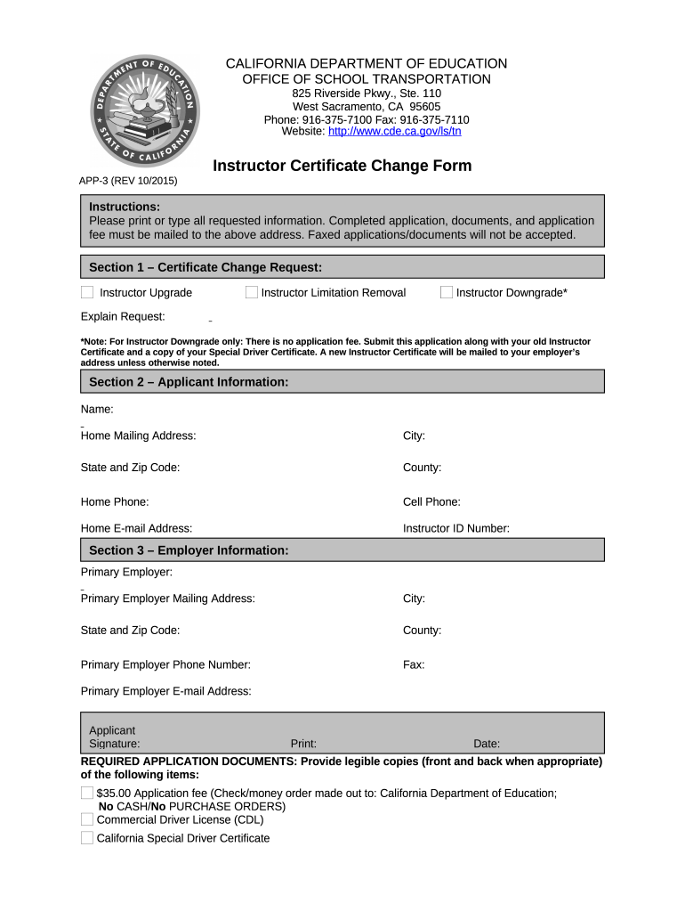Instructor Certificate Change - Transportation (CA Dept of Education). This is the instructor certificate change that must be submitted to the California Department of Education, Office of School Transportation when there is a change of bus template instructions