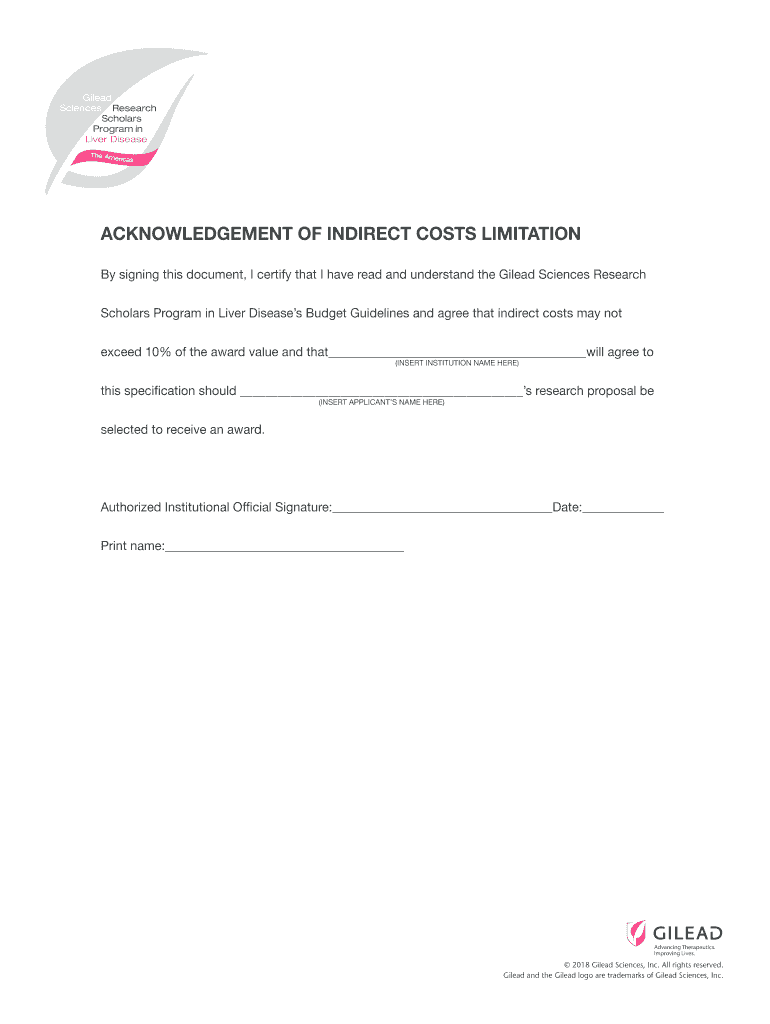 ACKNOWLEDGEMENT OF INDIRECT COSTS LIMITATION By signing this document, I certify that I have read and understand the Gilead Sciences Research Scholars Program in Liver Diseases Budget Guidelines and