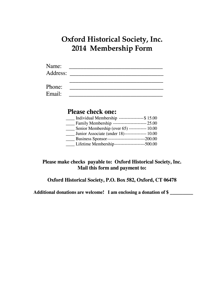 Oxford Historical Society, Inc. 2014 Membership Form Name: Address: Phone: Email: Please check one: Individual Membership $15.00 Family Membership 25.00 Senior Membership (over 65) 10.00 Junior Associate