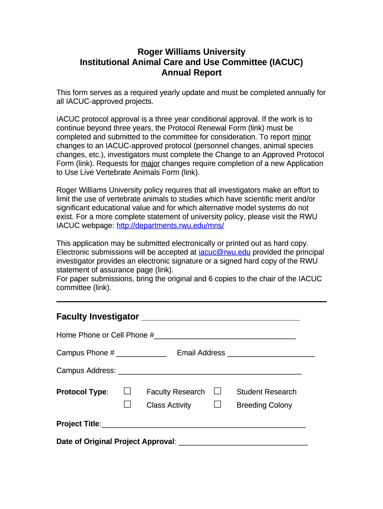 The Institutional Animal Care and Use CommitteeRoger ... is a document you can get filled-out and signed for certain purposes. Next, it is provided to the exact addressee to provide some details of certain kinds. The completion and signing is able manually in hard copy or using an appropriate tool like PDFfiller. Such services help to send in any PDF or Word file without printing them out. It also allows you to customize it depending on your requirements and put a legal digital signature. Once finished, the user ought to send the Institutional Animal Care and Use CommitteeRoger ... to the recipient or several of them by mail and also fax. PDFfiller provides a feature and options that make your template printable. It provides various options when printing out appearance. It does no matter how you distribute a form - physically or by email - it will always look professional and organized. To not to create a new file from scratch all the time, make the original file into a template. After that, you will have a customizable sample.