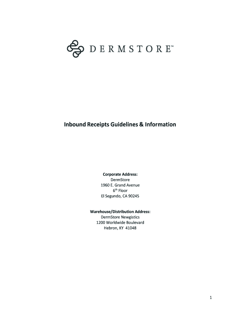 Inbound Receipts Guidelines & InformationCorporate Address: Dermatome 1960 E. Grand Avenue 6th Floor El Segundo, CA 90245Warehouse/Distribution Address: Dermatome Logistics 1200 Worldwide Boulevard