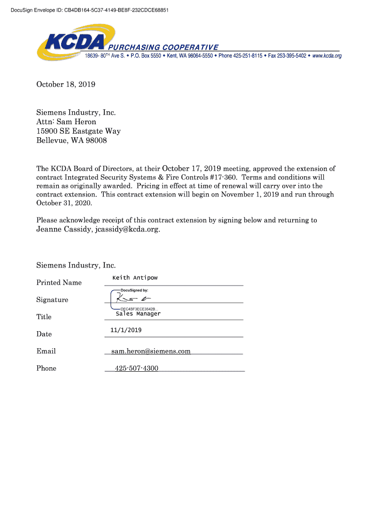 DocuSign Envelope ID: CB4DB1645C374149BE8F232CDCE68851PURCHASING COOPERATIVE18639 80TH Ave S. P.O. Box 5550 Kent, WA 980645550 Phone 4252518115 Fax 2533955402 www.kcda.orgOctober 18, 2019 Siemens