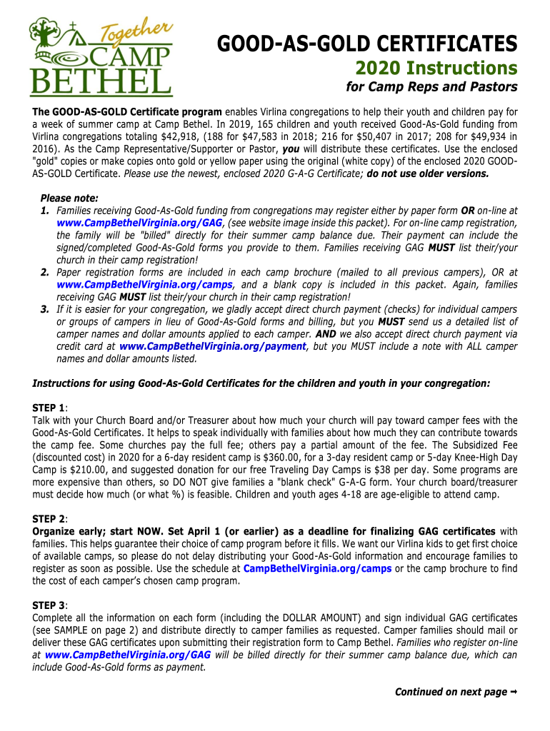 GOODASGOLD CERTIFICATES2020 Instructions for Camp Reps and Pastorate GOODASGOLD Certificate program enables Virginia congregations to help their youth and children pay for a week of summer camp at