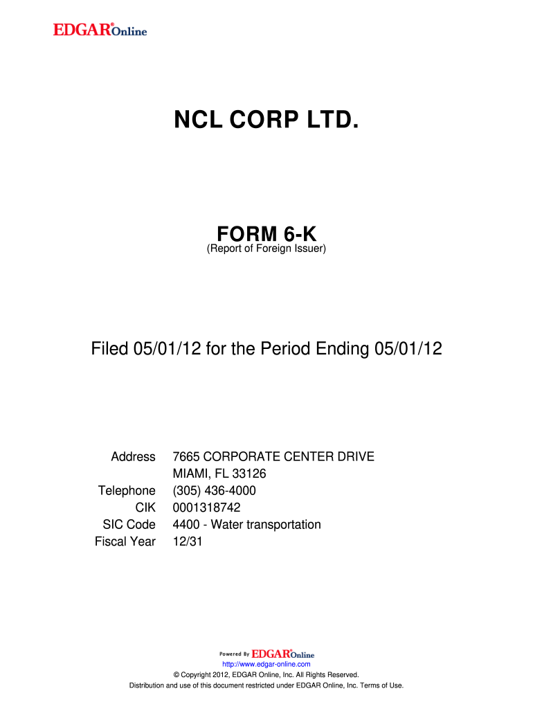 NCL CORP LTD.FORM 6K(Report of Foreign Issuer)Filed 05/01/12 for the Period Ending 05/01/12Address Telephone CIK SIC Code Fiscal Year7665 CORPORATE CENTER DRIVE MIAMI, FL 33126 (305) 4364000 0001318742