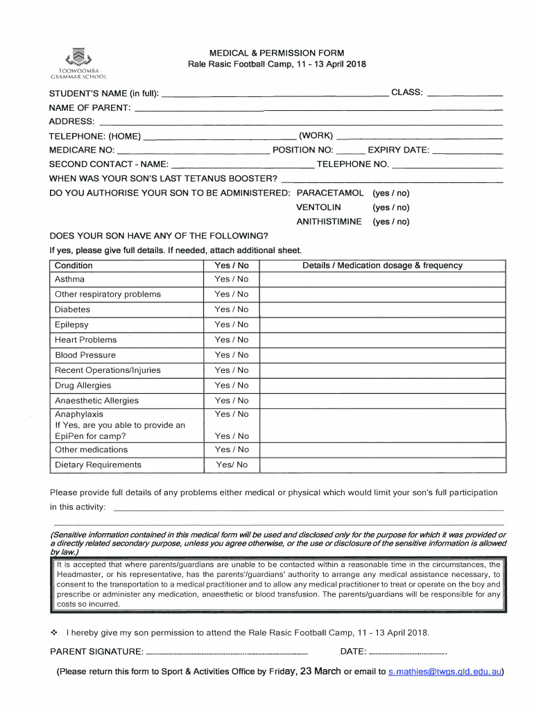 TOOWOOM8A GRAMMAR School. MEDICAL & PERMISSION FORM Rale Basic Football Camp, 11 13 April 2018STUDENT IS NAME (in full): CL ASS : NAME OF PARENT: ADDRESS: TELEPHONE: (HOME (WORK) MEDICARE NO: POSITION
