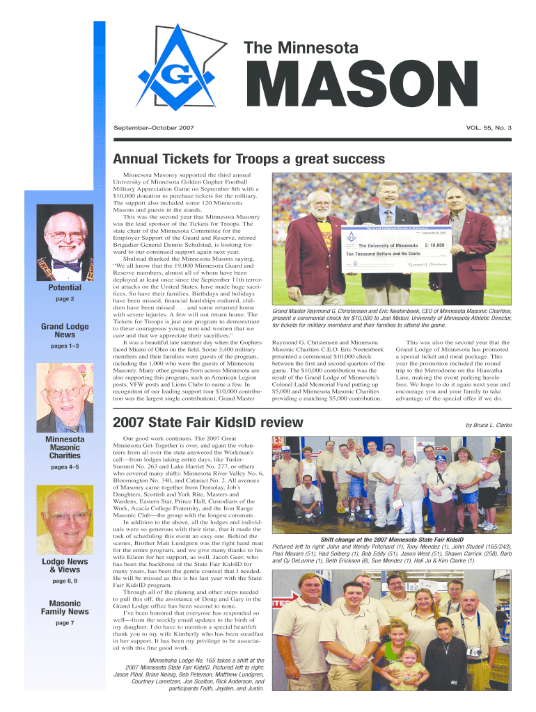 The Minnesota MASON September October 2007 VOL. 55, No. 3 Annual Tickets for Troops a great success Potential page 2 Grand Lodge News pages 1 3 Minnesota Masonry supported the third annual University