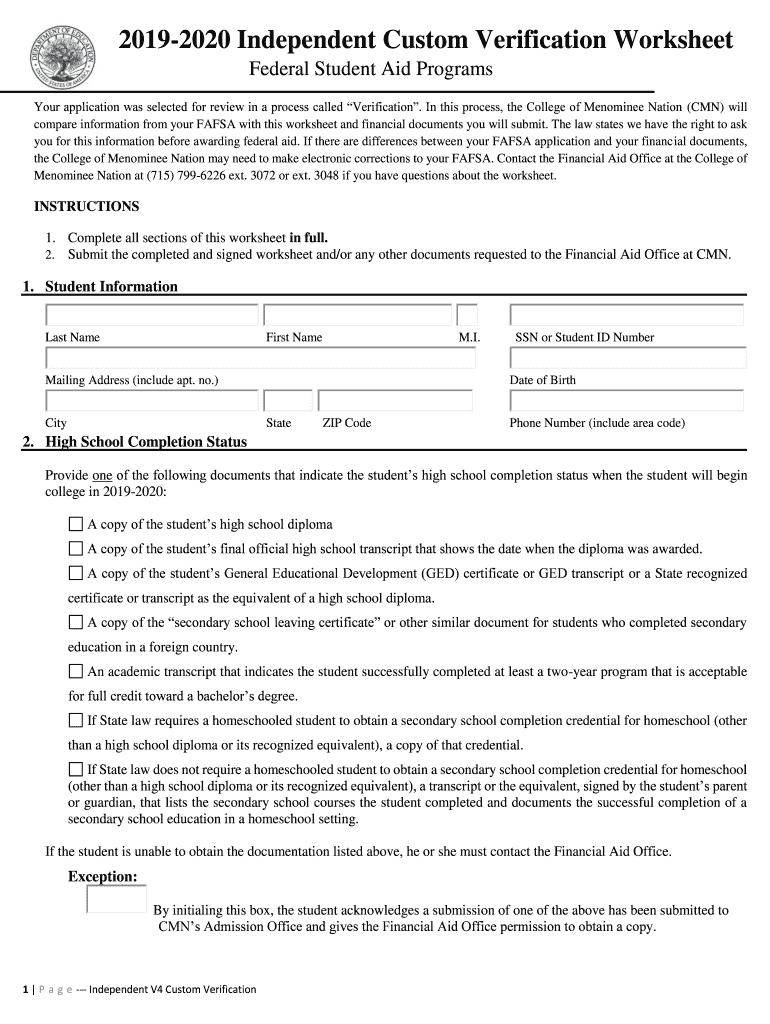 Students applying for federal financial aid or tribal funding may be required to file relevant forms with the College of the Menominee Nation.